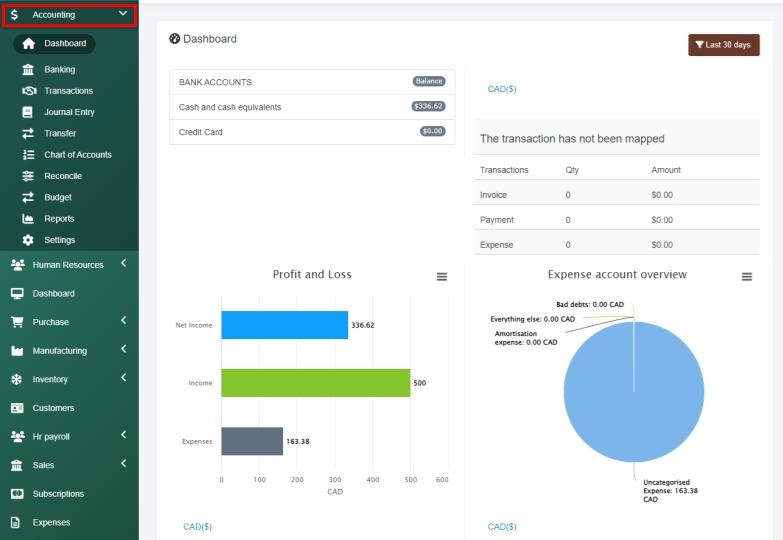 Automated Accounting reduces the administrative burden and data entry requirements and works to ensure fewer accounting errors occur. Our accounting module automatically maps all transactions that occur within the system and can produce a full set of bookkeeping reports at any time, allowing you to understand how your business is performing financially at any point in time. Your accounting module will be located within the left navigation menu and when selected you will find the following tabs: dashboard, banking, transactions, journal entry, transfer, chart of accounts, reconcile, budget, and reports.