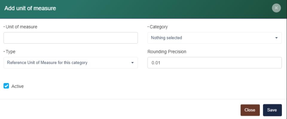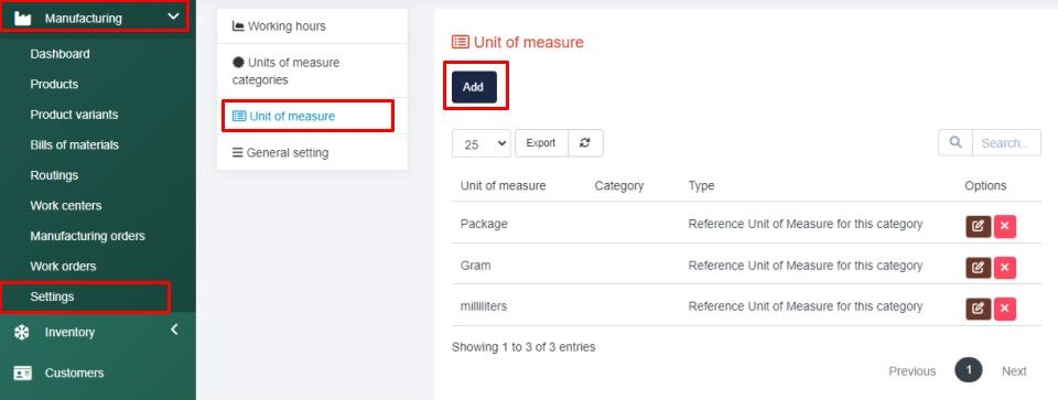 Navigate to Manufacturing > Settings. When selected you will be taken to the Working hours tab and below this tab you be able to select into the Unit of measure tab where you can edit or delete units or select the Add button. On this screen you will type in the Unit of Measure, select the Category, select the Type, Rounding Precision, and Save your new unit details.