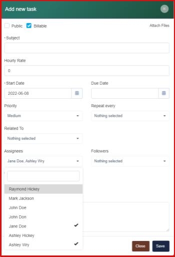 When creating a task select the Assignees and Followers drop downs to search through your staff members list and you can select multiple staff members if desired.