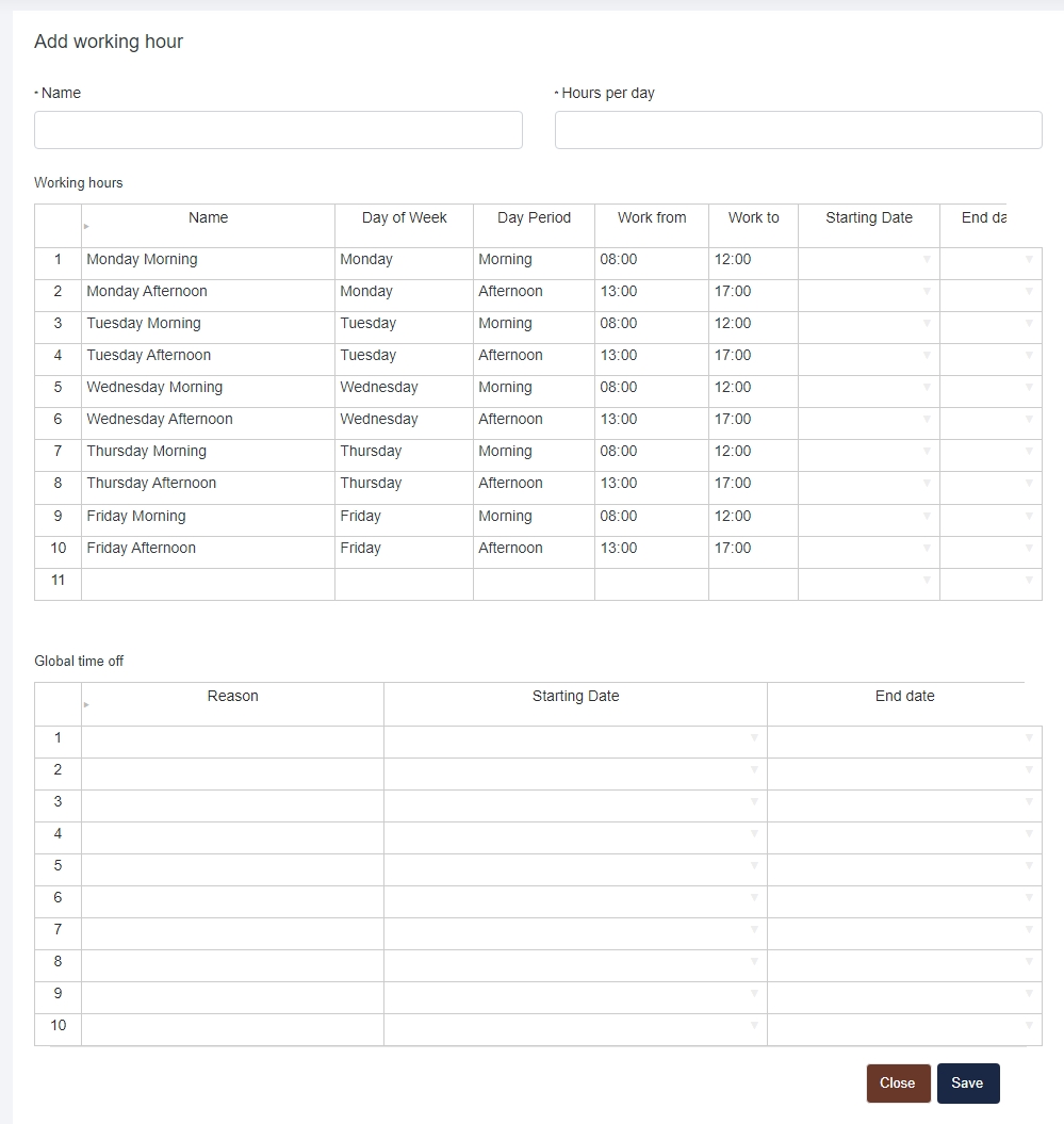 Here you can also set Global time off by providing a reason, start date, and end date. Then Save your working hours information.