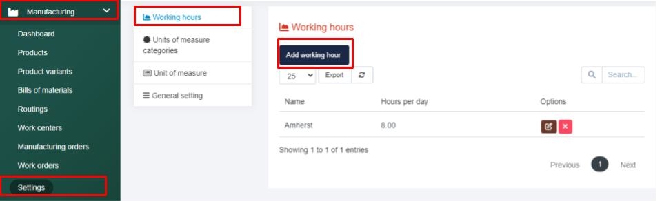 Navigate to Manufacturing > Settings. When selected you will be taken to the Working hours tab. Here you can edit or delete working hours under the options tab or you can select the Add working hours button to add in the locations name, hours per day, and control the working hours per week.