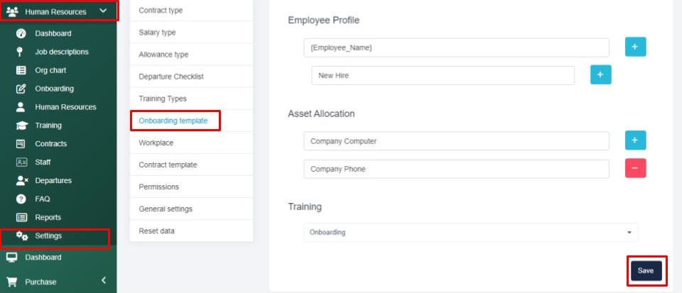 Navigate to the Human Resources > Settings tab and select the Onboarding template tab. Here you can use the “+” buttons to add lines under each section or remove a line using the “-” button. Then select the training this is applicable for and Save your onboarding template.