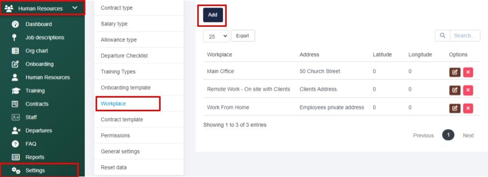 Navigate to the Human Resources > Settings tab and select the Workplace tab. Here you can edit any existing workplace details by selecting the Edit button, or delete a workplace by selecting the “x” button and confirming the action. Once the data is deleted, it cannot be restored.