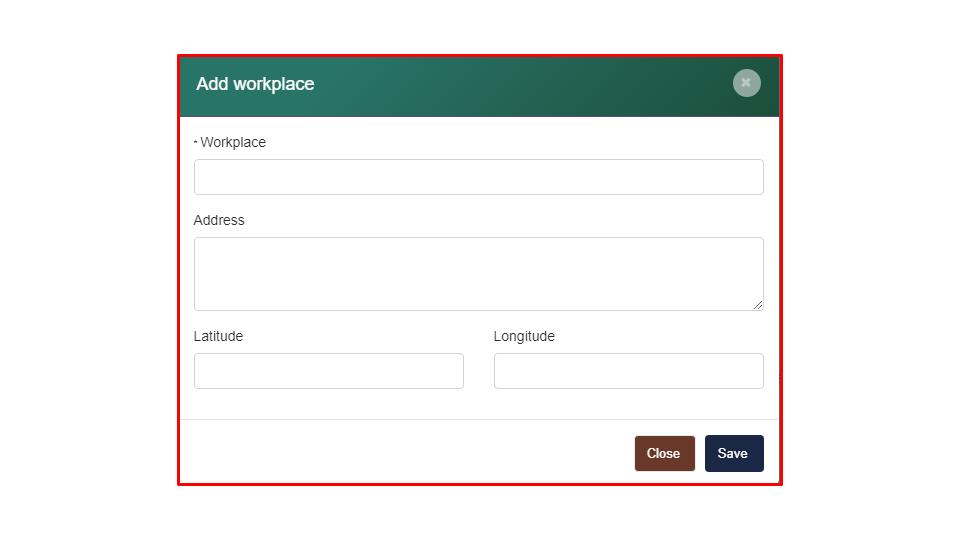 To add a workplace, select the Add button, enter in the workplace name, address, and the options to include latitude and longitude are available but not required. Once your data is entered make sure to Save your workplace information.