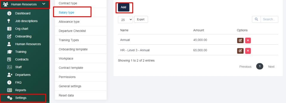 Next select the Add button, type in the salary type name and enter the amount then Save your salary type.