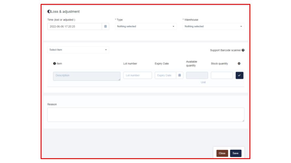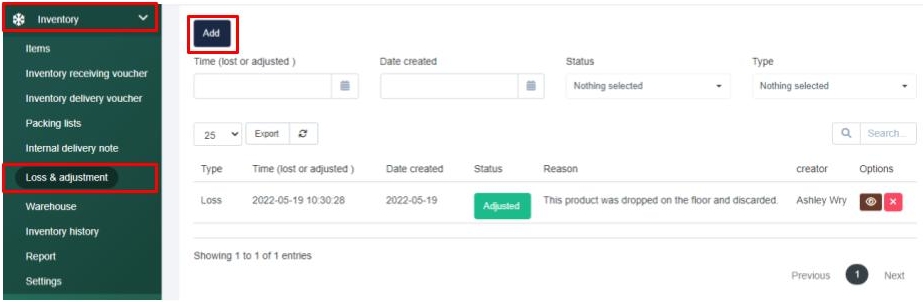 Navigate to Inventory > Loss & Adjustment. Within this tab you can manage and track your loss and adjustments by recording the data within the system.