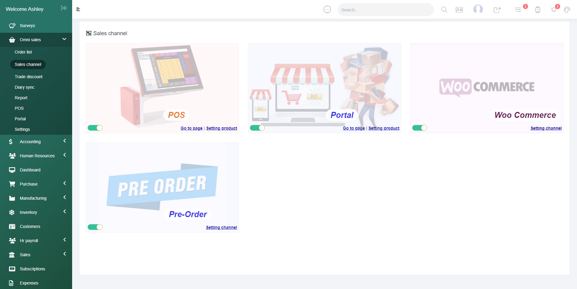 To manage your Omni Sales Channels you can navigate the left navigation menu until you find Omni Sales or Sales Channels. Within this drop-down you can review your order lists, manage your sales channels, manage trade discounts, review reports, quickly access your POS or access your other sales portals.