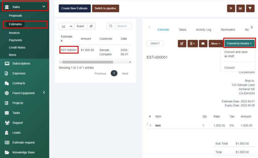 Navigate to the Sales > Estimates tab. From here you can select an estimate number to quickly view the details on the right side of your screen. On this screen, you will see a Convert to Invoice button to easily convert your sales estimate to an invoice.