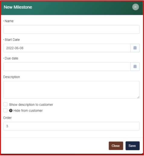 Then give your milestone a name (this will appear in view mode), then select a start date, a due date, provide a description, and select whether you want to show the description to the customer or not, or hide the milestone from the customer. Then you can control the order this appears in and Save the milestone.