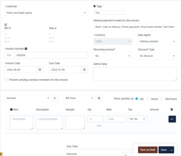 After you have the customer details selected the bill to information will pre-fill with the data you have on file. Then the invoice number will auto-fill as the next available, the invoice date will fill as today's date unless you manually change it, and you can set the invoice due date. Below this, you can choose to select the “Prevent sending overdue reminders for this invoice” if desired. Then you can tag the invoice as you see fit, select the allowed payment modes for the invoice, assign a sales agent, select if the invoice is a recurring invoice, and select the discount type if applicable. Then you can leave any admin notes, and select the Add Item drop-down menu to select the items you would like to add. You will have to add each line item to the invoice by selecting the checkmark at the end of the line.