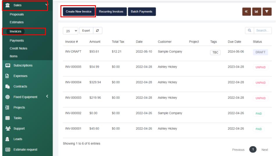 Navigate to Sales > Invoices then select the Create New Invoice button. First, you will have to select the Customer by entering the company name the invoice is associated with. Once selected the bill and ship to information will automatically fill in with the data you have on file.