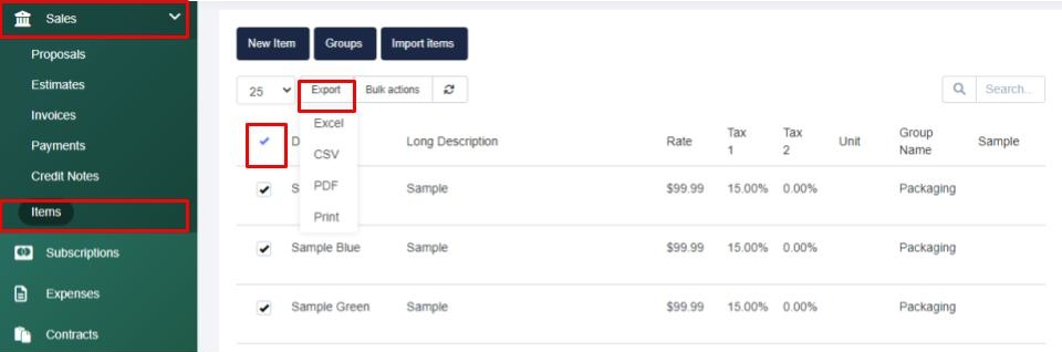 Navigate to the Sales > Sales Items tab and select the Items you would like to export by selecting the checkbox beside the item, then select the Export button and select your preferred file type.