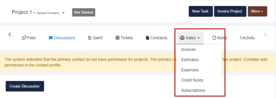 Navigate to the Projects tab and select your Project. From there select the Sales to access a drop-down menu where you can access Invoices, Estimates, Expenses, Credit Notes, or Subscription details.