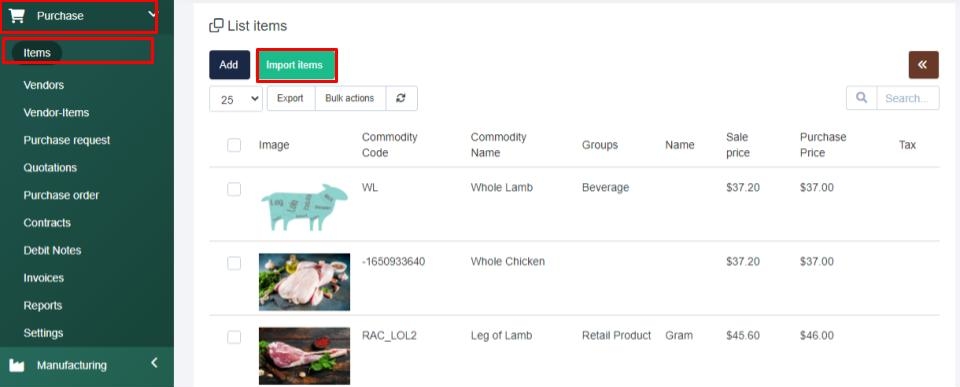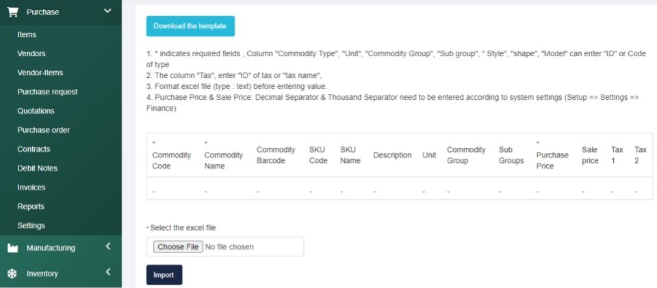 Navigate to Purchase > Items. Select the Import Items button. When selected you will be taken into the import screen where you can download the sample, fill out the file, and upload the file, then select the Import button to import the data.