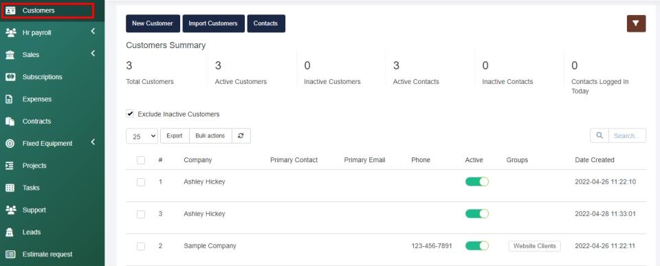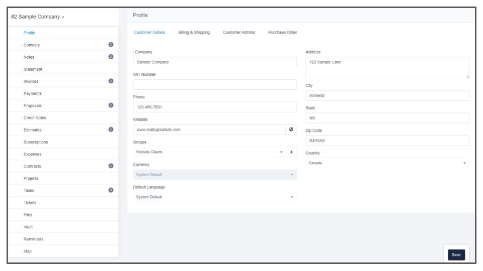 Within each company profile, you can easily access customer Statements, Payments, and Files, or you can edit/create/view customers' Invoices, Estimates, Proposals, Credit Notes, Subscriptions, Expenses, Contracts, Projects, Tasks, and Reminders.