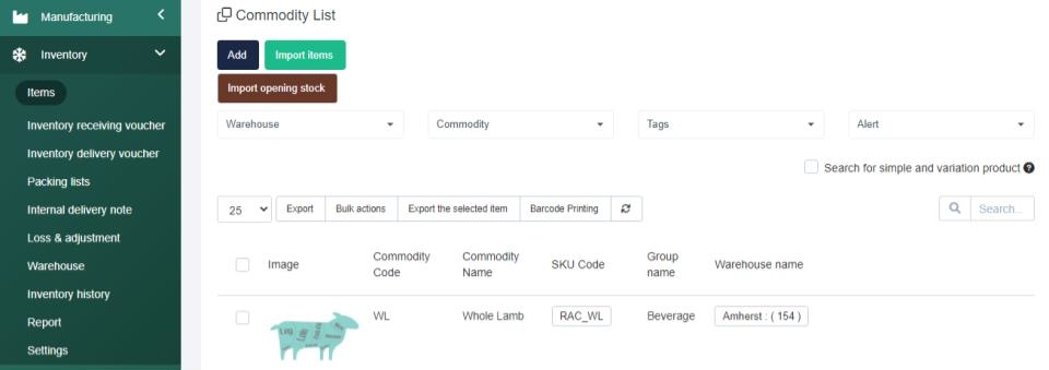 Items > This tab displays your commodity list when clicked. This shows a summary of all of your products. On this screen you can add, edit, or view items. A prompt for barcode printing is available, as well as an export list. You can also import existing inventory data if desired. To add an inventory item you have to enter the item's commodity code, name, sale, and purchase price, select tax if applicable, and add an image to easily distinguish between items. When adding or editing a commodity in your list, you can enter in the purchase and the sales price to automatically calculate your profit margins. Then you can add in the item's properties (your item’s origin, size, model, colour, style and warranty) and select whether the product can be sold, purchased, inventory, or just used in manufacturing, then enter in any product variations and save the new inventory item.