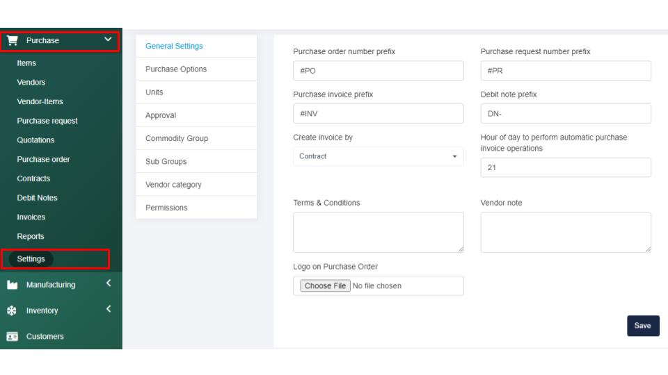 Navigate to Purchase > Settings. Here you will find the following tabs - General Settings, Purchase Options, Units, Approval settings, Commodity Group, Sub Groups, Vender Category, and Permissions settings. If you make any changes in a section, make sure to save your changes.