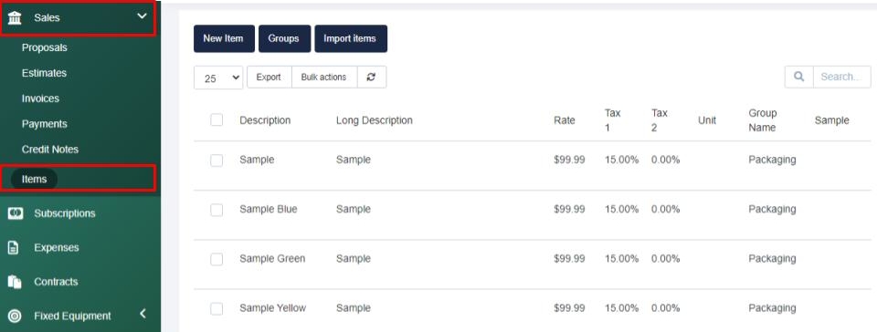 Navigate to the Sales > Sales Items tab. Here you can enter, edit, and manage the products your company offers. On the summary screen, you will see the product description, long description, rate, tax rates, and group it is associated with.