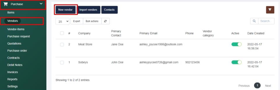 Navigate to the Purchase tab and select the dropdown to select Vendors. This section is built to help you manage all of the vendors.