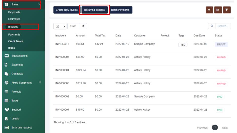 Navigate to Sales > Invoices and select the Recurring Invoices button. This button will take you to a summary page of all of the recurring invoices set up within your system. Here you can export, edit, or search through the data at any time.