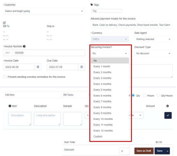 To create a recurring invoice, create a sales invoice as usual but ensure you select the Recurring Invoice dropdown menu to set the invoice frequency.