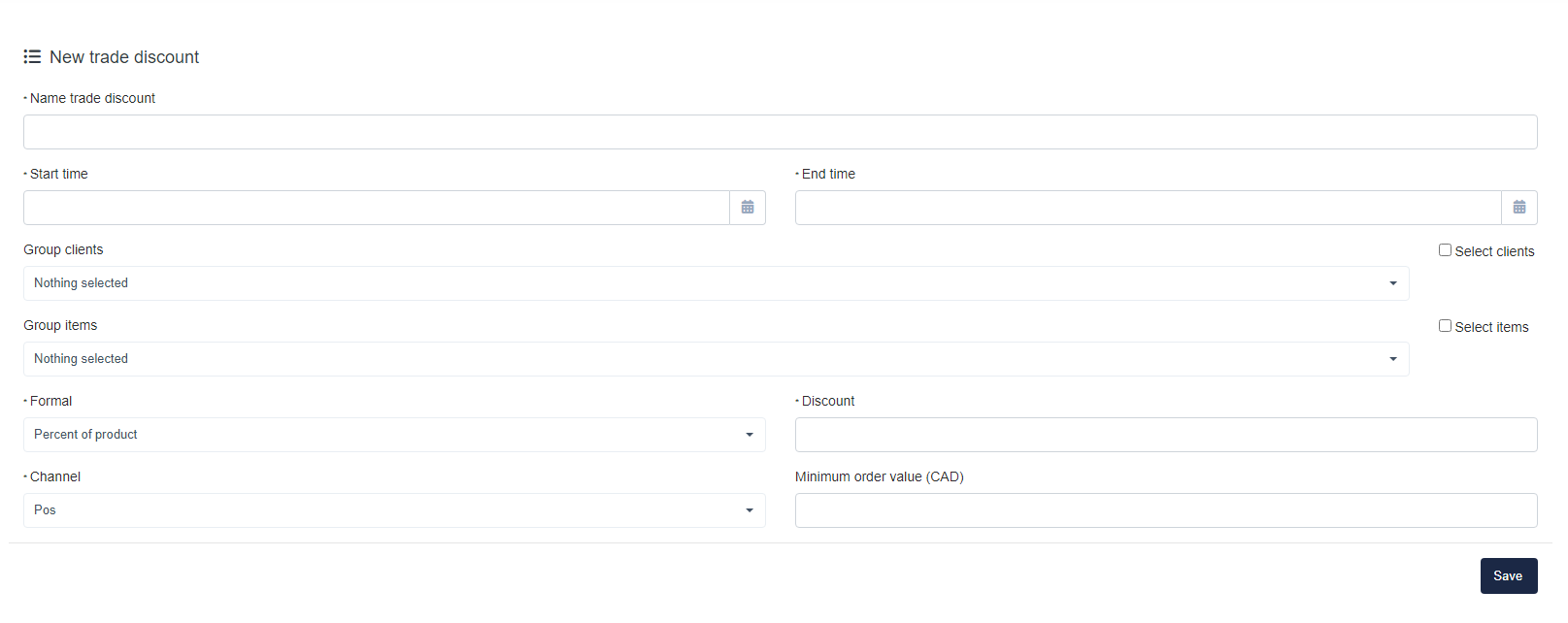 To create a Trade Discount, select the Add button on the Promotions tab. Next, give your discount a name, select the start and end time and date, select the client groups this discount will be available to, then select the items the discount is available for. Next, you can select the discount format to apply to a percentage of the product, or to the price, and enter in the discount amount, select the sales channel, and you can choose to enter a minimum order value for the discount to be applied to. Then Save your discount details.