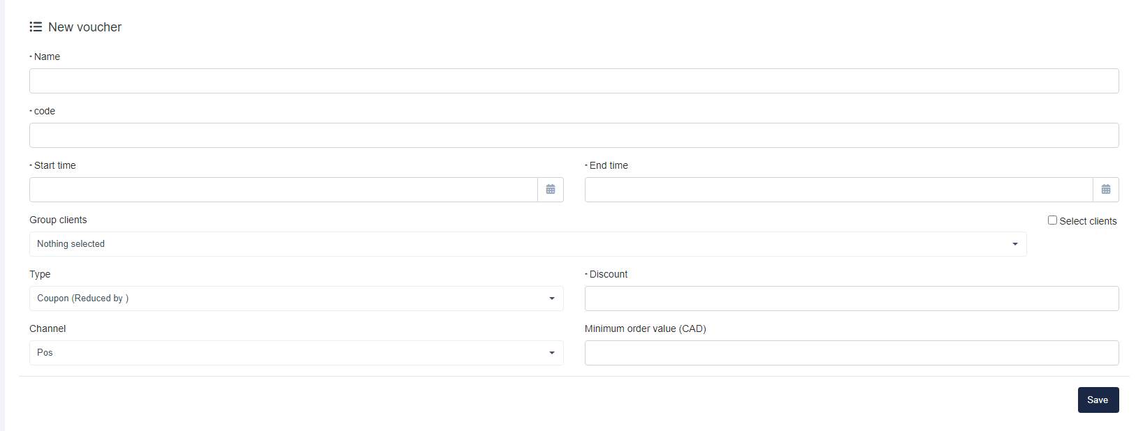To create a Voucher, select the Voucher tab, and select the Add button. Once selected, give your discount a name, enter in the code, select the start and end date and time, and then select the clients this is available for, the items the discount will be related to, and select the type as a coupon or voucher, enter in the discount amount, select the sales channel, and you can choose to enter a minimum order value for the discount to be applied to. Then Save your discount details.