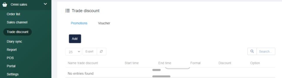 Navigate to Omni Sales > Trade Discount. If you would like to release discounts on your sales channels, there are two options readily available. - Promotions or Voucher so you can offer a storewide promotion, or promotional codes.