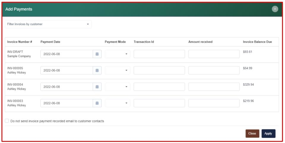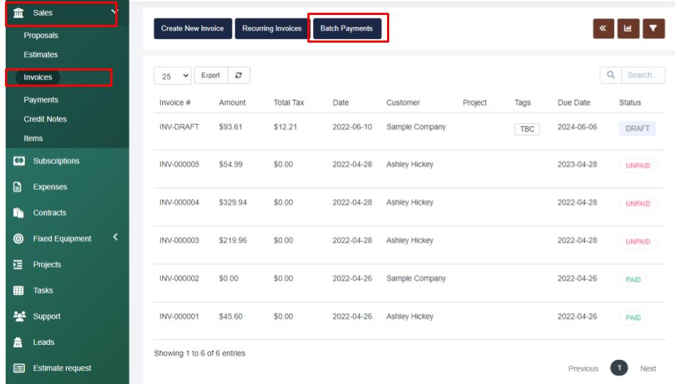 Navigate to Sales > Invoices and select the Batch Payments button. By selecting this button you will be taken into an Add Payments screen where you can filter your systems invoices by customer, then record multiple payments with ease by selecting the payment mode, giving the transaction a unique ID, then noting the amount received and then selecting Apply to record the batch payments.