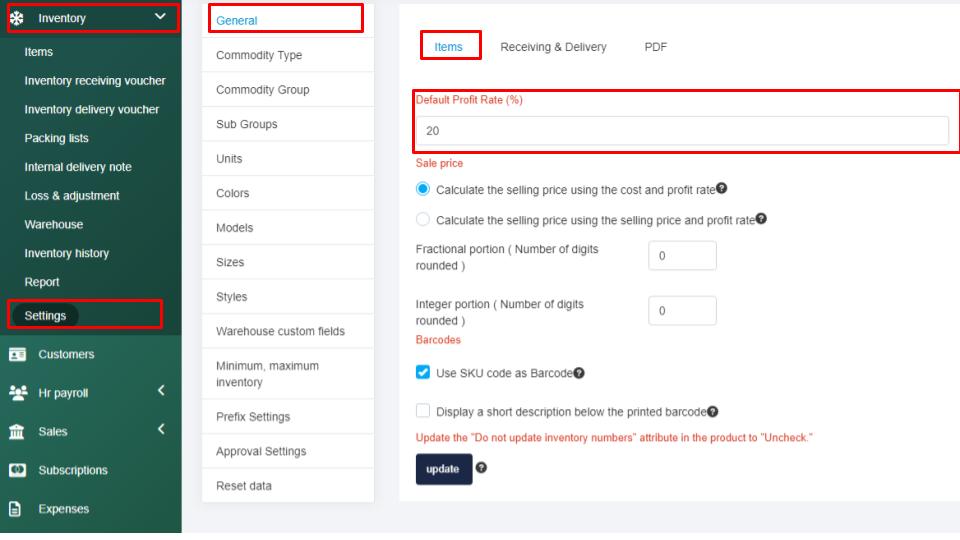 Navigate to Inventory > Settings and on the General tab you can set a default profit rate, entered as a percentage, and Update your settings.