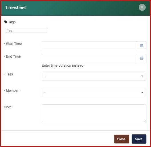 From there you will enter the start and end time, select the project task the time was associated with, then select the staff member, and leave any notes as desired then save the timesheet.