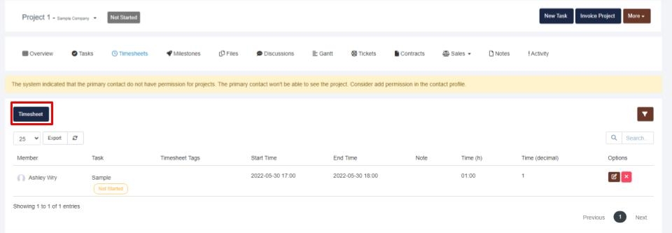 Navigate to the Projects tab and select into your Project. From there select into the Timesheets tab. Within the timesheets tab you can record your time worked on a project by selecting the Timesheets button.
