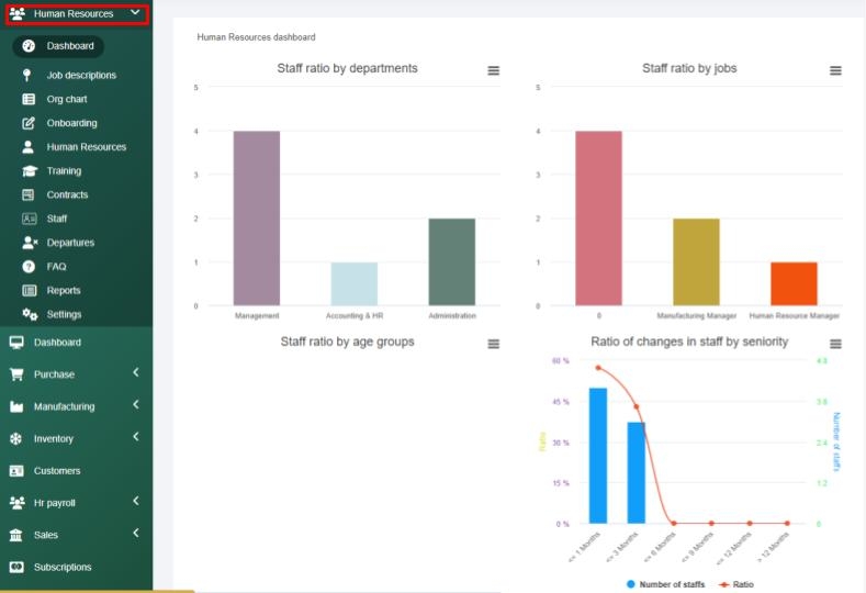 HR Dashboard > On your HR Dashboard you will be able to see staff ratios by department or jobs, ratios of changes in staff by seniority, staff status by month, birthdays that occur in the current month, and staff members that have not completed their onboarding checklist.