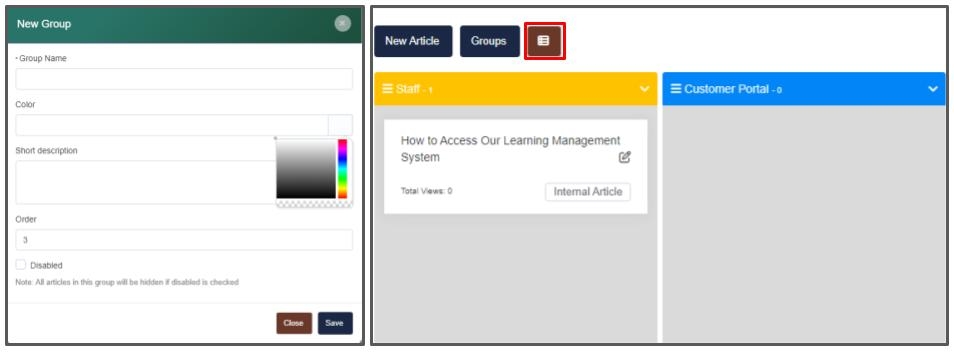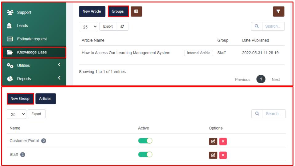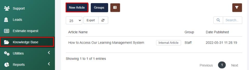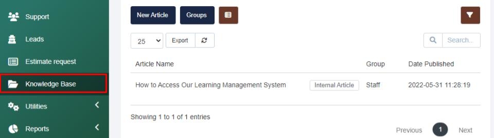 This section allows you to release information to your staff, as well as, onto your client portal. You can find the Knowledge Base section on the left navigation menu. When selected, you can see and manage any existing articles that are available to your staff or your clients, create new articles, and create new groups for your articles.