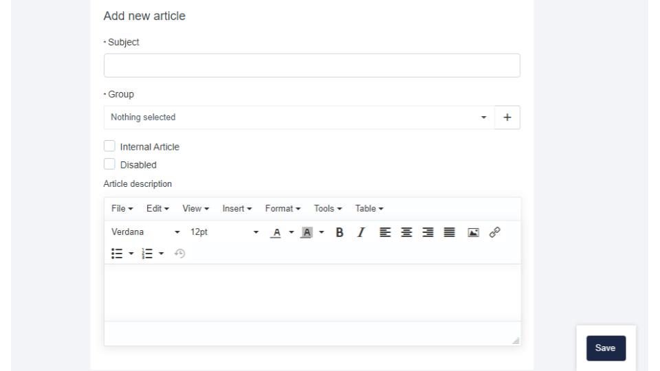 To create a new article, select New Article. From there you will have to give your document a name, select the group it is associated with, select whether it is an internal article or not, select if disabled or not (great for in-progress content), then provide the article description. If desired you can select the Insert option to insert images or media files from your media storage.