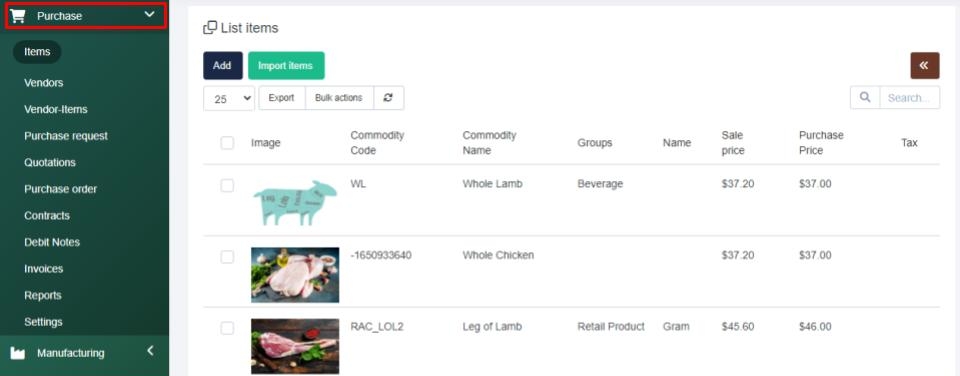 Virtually managing your purchases allows you to have enhanced reporting capabilities. Within the left navigation pane, you can find the Purchase tab. When selected you will see the following tabs: items, vendors, vendor items, purchase requests, quotations, purchase orders, contracts, debit notes, invoices, and reports.