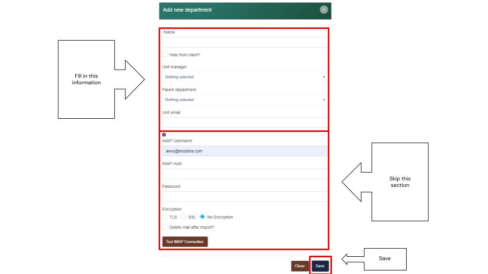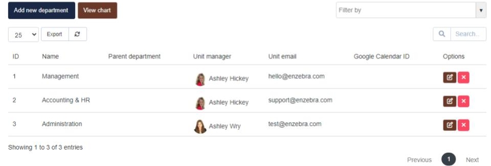 You can also Add a New Department within this section by selecting the button, adding the department name, selecting the unit manager, the parent department, the unit email, and then Save the data.