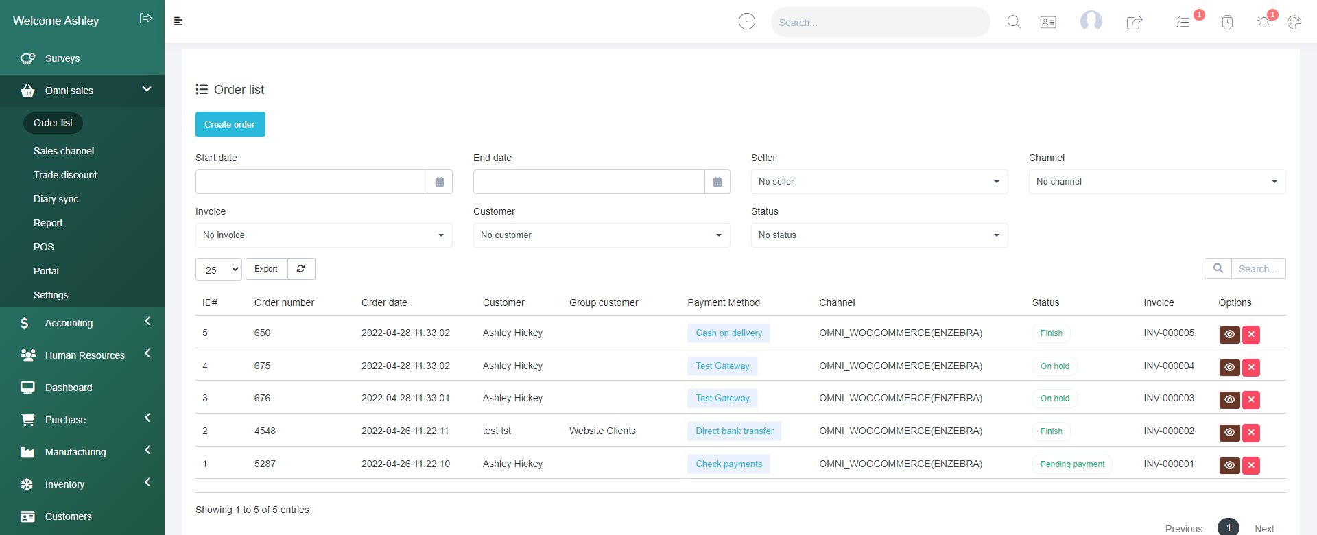 Navigate to Omni Sales > Order Lists. Within this tab, you can find an order summary of any purchases made through your sales channel(s), providing an order date, order number, invoice, and payment method. You can also see which of the channels the order came through.